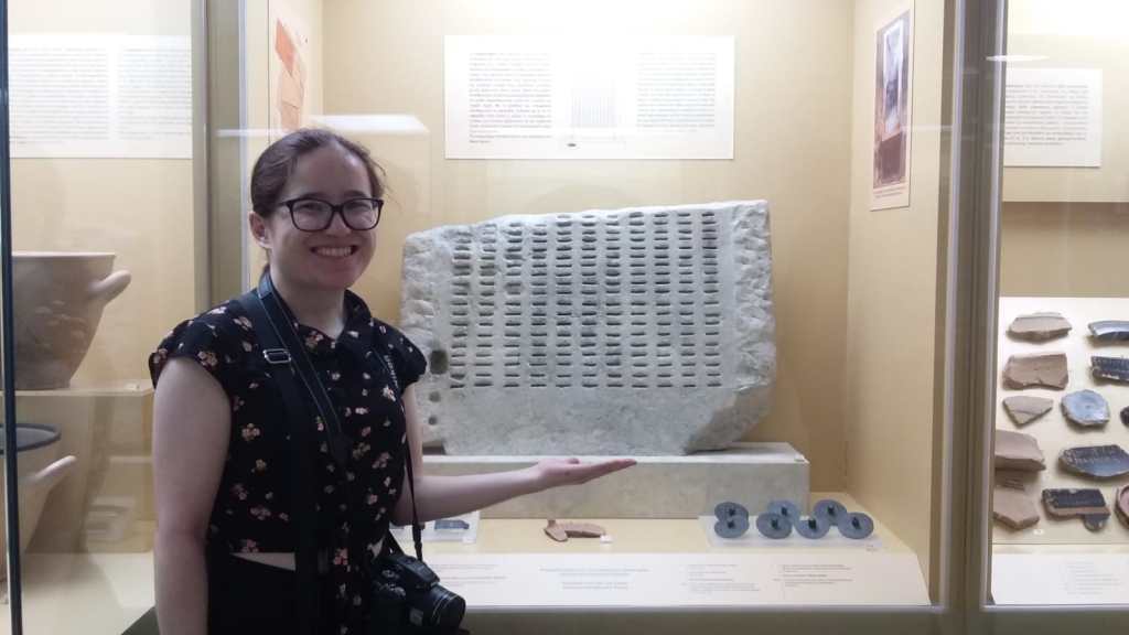 (Photo: Katherine Prouting in front of the Kleroterion – Jury Selection Device. Ancient Agora Museum Athens 2019)